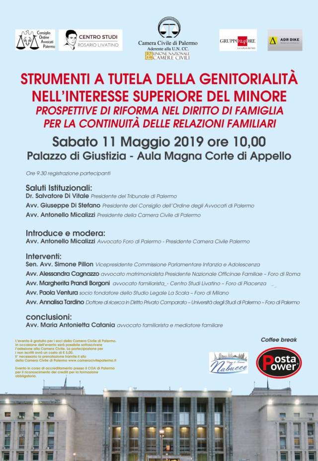Il giorno 11 maggio 2019 alle ore 10,00, presso l’Aula Magna della Corte di Appello di Palermo, si terrà l’evento formativo sul tema: “Strumenti a tutela della genitorialità nell’interesse superiore del minore, prospettive di riforma nel diritto di famiglia per la continuità delle relazioni familiari“.