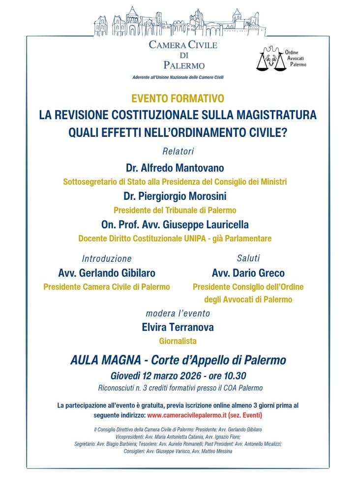 La scelta di aprire l’anno con un confronto su una riforma di rango costituzionale conferma la volontà della Camera Civile di Palermo di partecipare attivamente al dibattito pubblico, promuovendo un dialogo istituzionale fondato su competenza, equilibrio e responsabilità. In un momento storico in cui il tema delle riforme incide direttamente sull’esercizio della professione forense e sulla tutela dei diritti, l’Associazione intende offrire un’occasione di riflessione condivisa, capace di coniugare approfondimento tecnico e apertura al confronto.