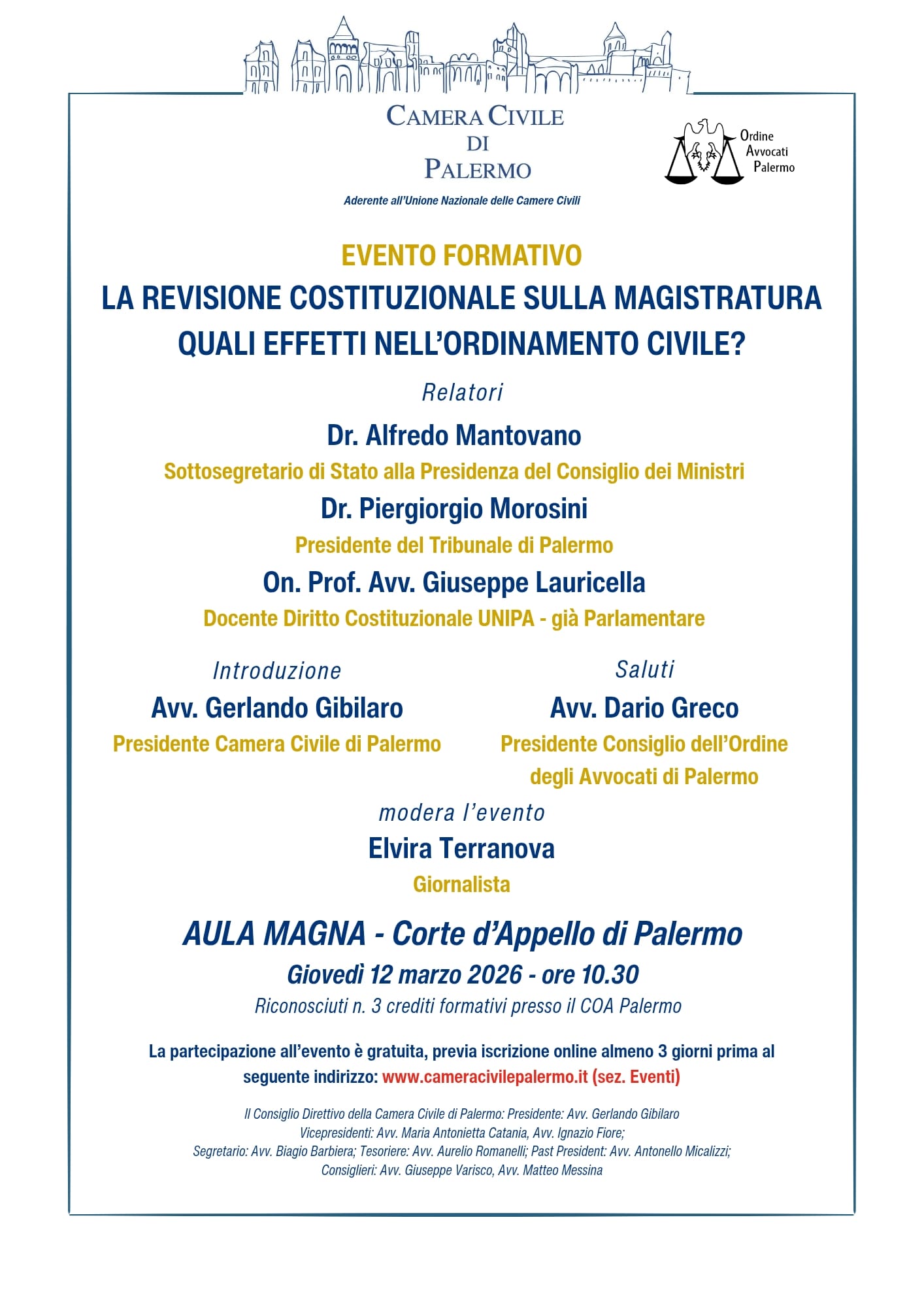 La scelta di aprire l’anno con un confronto su una riforma di rango costituzionale conferma la volontà della Camera Civile di Palermo di partecipare attivamente al dibattito pubblico, promuovendo un dialogo istituzionale fondato su competenza, equilibrio e responsabilità. In un momento storico in cui il tema delle riforme incide direttamente sull’esercizio della professione forense e sulla tutela dei diritti, l’Associazione intende offrire un’occasione di riflessione condivisa, capace di coniugare approfondimento tecnico e apertura al confronto.